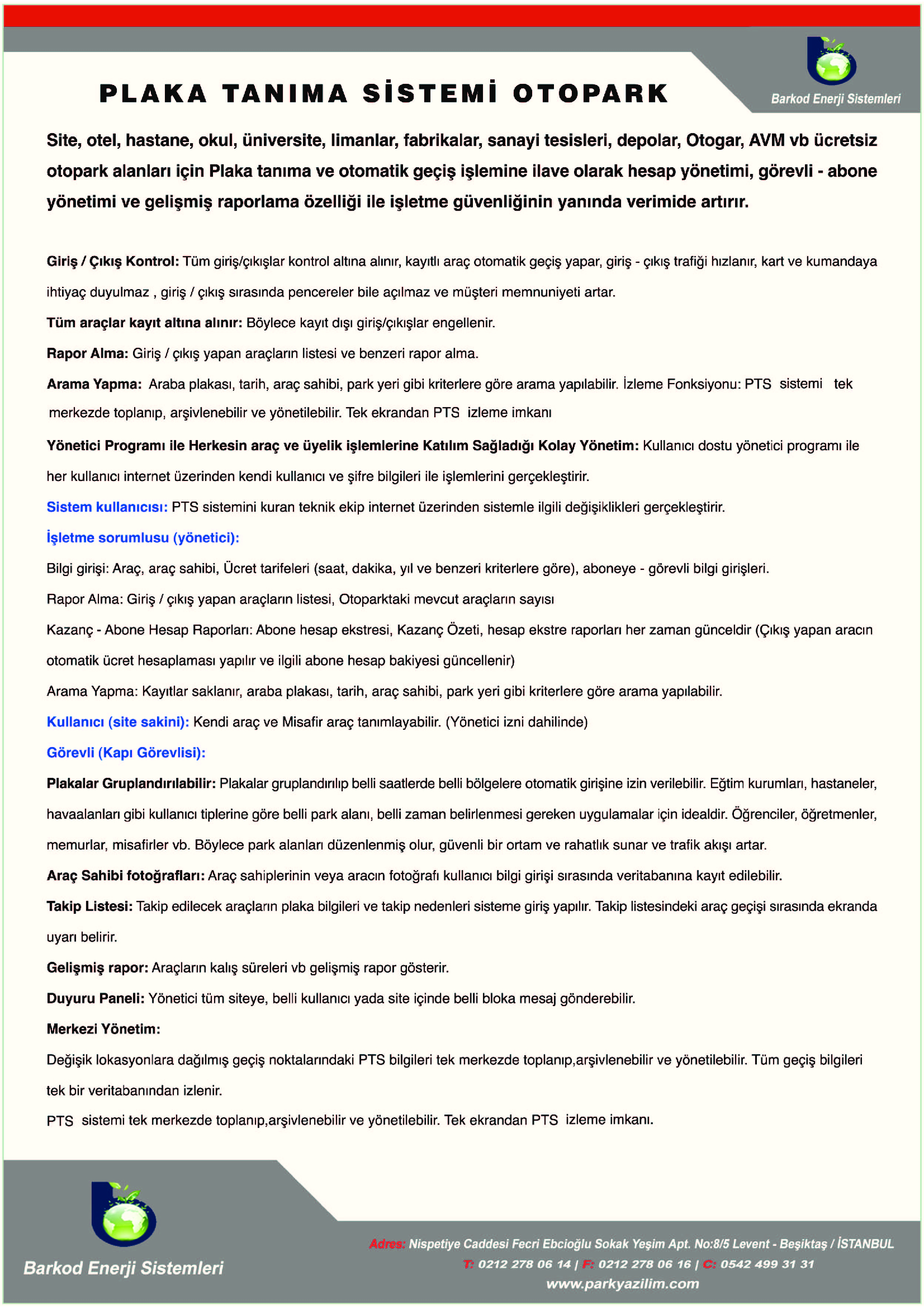 parkMETRE PLAKA TANIMA SİSTEMİ ÜCRETLİ OTOGAR, ÜCRETLİ OTOPARK, SİTE VE OTOBAN OLMAK ÜZERE 4 AYRI YAZILIM BULUNMAKTADIR.